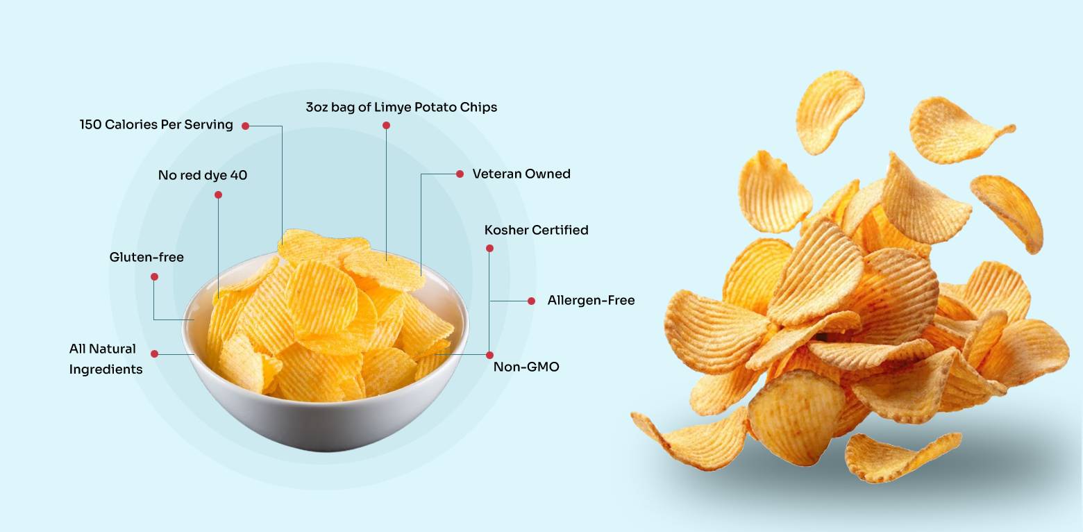 Limyé Potato Chips, World Spice Flavor, offer a delicious and health-conscious snacking option perfect for all dietary needs. These Kosher Certified, Gluten-Free, Non-GMO, and Vegan-friendly chips come in convenient 3-ounce bags & 1.5-ounce bags and deliver a bold, zesty flavor with no artificial ingredients.